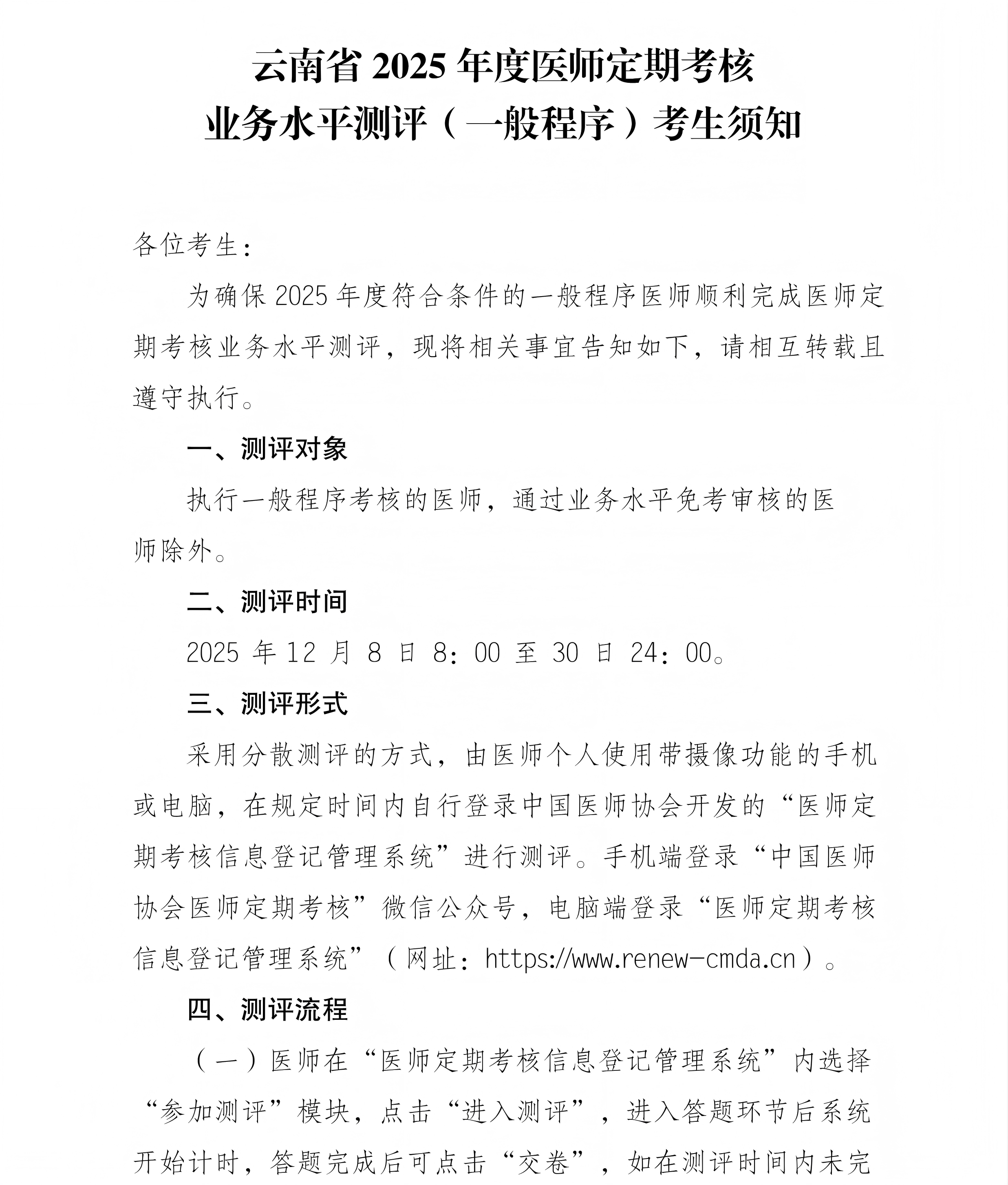 云南省2025年度医师定期考核业务水平测评(一般程序)考生须知