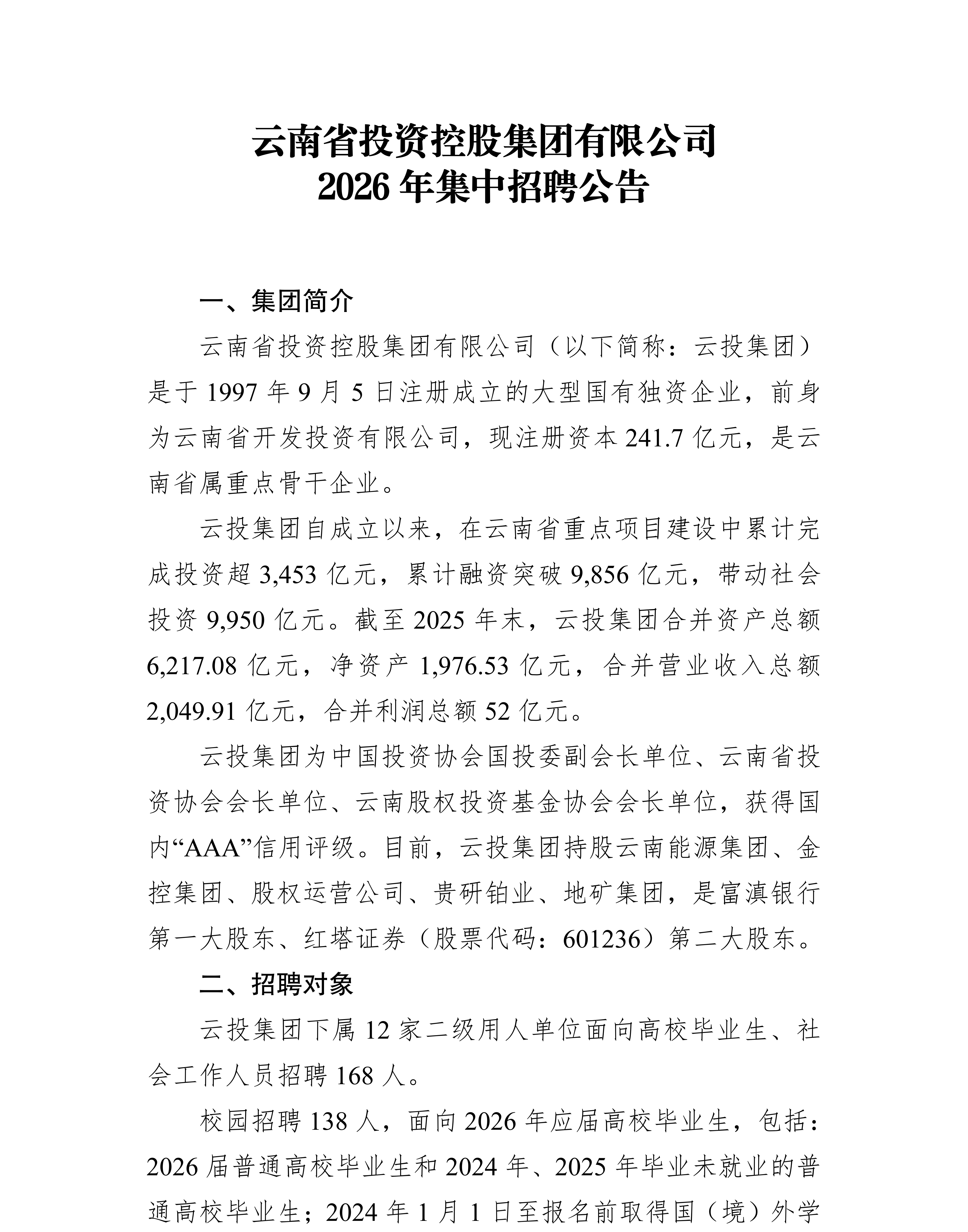 云南省投资控股集团有限公司2026年集中招聘公告